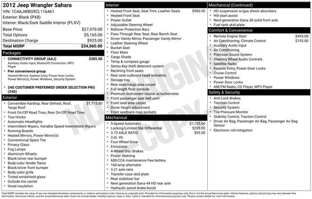 2012 Jeep Wrangler Sahara Black Clearcoat Clean Carfax, Leather Seats, Heated Seats, 4 Wheel Drive, Local Trade-in, Passed Rigorous Safety Inspection Performed by Certified Technician, Free Lifetime Car Washes, Free State Inspections, Wrangler Sahara, 2D Sport Utility, 3.6L V6 24V VVT, 5-Speed Automatic, 4WD, Black Clearcoat, Saddle Leather.