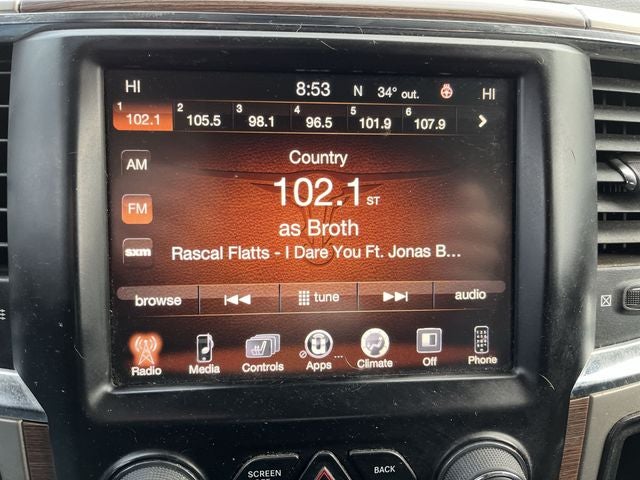 This 2015 Ram 1500 Laramie in Brilliant Black Crystal Pearlcoat is nicely equipped with the following features Quick Order Package 26H Laramie, 10 Speakers, 115V Auxiliary Power Outlet, 20 x 9 Chrome Clad Aluminum Wheels, 3.21 Rear Axle Ratio, 4-Wheel Disc Brakes, 8.4 Touchscreen Display, ABS brakes, Active Grille Shutters, Adjustable pedals, Air Conditioning, Alloy wheels, AM/FM radio, Audio memory, Auto-dimming door mirrors, Auto-dimming Rear-View mirror, Automatic temperature control, Brake assist, Bumpers: chrome, Center Hub, Compass, Delay-off headlights, Driver door bin, Driver vanity mirror, Dual front impact airbags, Dual front side impact airbags, Electronic Shift, Electronic Stability Control, Emergency communication system, Folding Flat Load Floor Storage, Front anti-roll bar, Front Center Armrest w/Storage, Front dual zone A/C, Front fog lights, Front reading lights, Front wheel independent suspension, Fully automatic headlights, Garage door transmitter, GPS Antenna Input, Harman Radio Manufacturer, Heated door mirrors, Heated Front Seats, Heated front seats, Heated steering wheel, High Back Seats, Illuminated entry, Integrated Voice Command w/Bluetooth®, Leather steering wheel, Leather Trim 40/20/40 Bench Seat, Low tire pressure warning, Media Hub (SD, USB, AUX), Memory seat, Occupant sensing airbag, Outside temperature display, Overhead airbag, Overhead console, Panic alarm, ParkView Rear Back-Up Camera, Passenger door bin, Passenger vanity mirror, Pedal memory, Power 10-Way Memory Driver & 6-Way Passenger Seats, Power door mirrors, Power driver seat, Power passenger seat, Power steering, Power windows, Radio data system, Radio: Uconnect 8.4A AM/FM/SXM/BT, Rear 60/40 Split Folding Seat, Rear anti-roll bar, Rear seat center armrest, Rear step bumper, Remote keyless entry, Security system, SIRIUSXM Satellite Radio, Speed control, Split folding rear seat, Steering wheel mounted audio controls, Tachometer, Tilt steering wheel, Tip Start, Traction control, Tri-Fold Tonneau Cover, Trip computer, Turn signal indicator mirrors, Uconnect Access, Variably intermittent wipers, Ventilated Front Seats, Ventilated front seats, and Voltmeter.