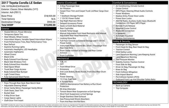 2017 Toyota Corolla LE Classic Silver Metallic Clean Carfax, Back Up Camera, Hands Free Calling, Local Trade-in, Passed Rigorous Safety Inspection Performed by Certified Technician, Free Lifetime Car Washes, Free State Inspections, Corolla LE, 4D Sedan, 1.8L I4 DOHC, CVT, FWD, Classic Silver Metallic, Ash w/Fabric Seat Trim, ABS brakes, Active Cruise Control, Electronic Stability Control, Heated door mirrors, Illuminated entry, Low tire pressure warning, Remote keyless entry, Traction control. Odometer is 1892 miles below market average! 28/36 City/Highway MPG