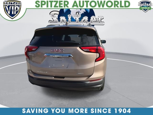 AWD. This 2018 GMC Terrain SLE in Coppertino Metallic is nicely equipped with the following features Driver Convenience Package (8-Way Power Driver Seat Adjuster, Driver & Front Passenger Heated Seats, Dual-Zone Automatic Climate Control, Power Driver Lumbar Control, Remote Start, and Roof-Mounted Luggage Rack Black Side Rails), Preferred Equipment Group 3SA, AWD, 2 USB Data Ports w/Auxiliary Input Jack, 3.47 Axle Ratio, 4-Way Manual Driver's Seat, 4-Way Manual Front Passenger Seat, 4-Wheel Disc Brakes, 6 Speakers, 6-Speaker Audio System Feature, ABS brakes, Air Conditioning, Alloy wheels, AM/FM radio, Apple CarPlay/Android Auto, Auto-dimming Rear-View mirror, Bluetooth® For Phone, Brake assist, Bumpers: body-color, Compass, Delay-off headlights, Driver door bin, Driver vanity mirror, Dual front impact airbags, Dual front side impact airbags, Electronic Stability Control, Emergency communication system: OnStar Guidance, Exterior Parking Camera Rear, Four wheel independent suspension, Front anti-roll bar, Front Bucket Seats, Front Center Armrest, Front reading lights, Fully automatic headlights, Heated door mirrors, High-Intensity Discharge Headlights, Illuminated entry, Low tire pressure warning, Occupant sensing airbag, Outside temperature display, Overhead airbag, Overhead console, Panic alarm, Passenger door bin, Passenger vanity mirror, Power door mirrors, Power steering, Power windows, Premium Cloth Seat Trim, Radio data system, Radio: GMC Infotainment Audio System w/7 Display, Rear anti-roll bar, Rear seat center armrest, Rear window defroster, Rear window wiper, Remote keyless entry, Security system, Skyscape Power Sunroof w/Power Sunscreen, Speed control, Speed-sensing steering, Split folding rear seat, Spoiler, Steering wheel mounted audio controls, Tachometer, Telescoping steering wheel, Tilt steering wheel, Traction control, Trip computer, Variably intermittent wipers, and Wheels: 17 x 7 Silver Painted Aluminum.