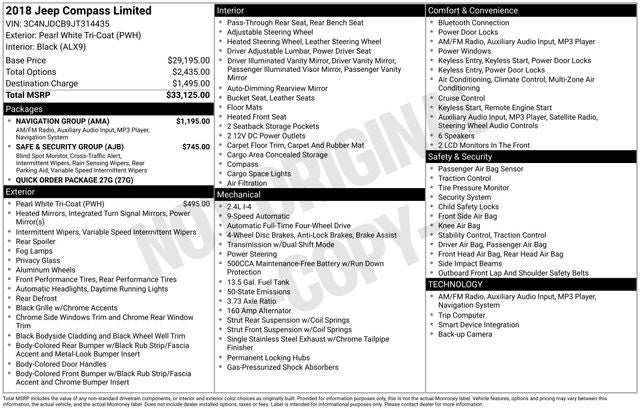 2018 Jeep Compass Limited Pearl White Tri-Coat Clean Carfax, Back Up Camera, Blindspot Monitor, Leather Seats, Heated Seats, Navigation, Hands Free Calling, 4 Wheel Drive, Local Trade-in, Passed Rigorous Safety Inspection Performed by Certified Technician, Free Lifetime Car Washes, Free State Inspections, Compass Limited, 4D Sport Utility, 2.4L I4, 9-Speed Automatic, 4WD, Pearl White Tri-Coat. Odometer is 3104 miles below market average! 22/30 City/Highway MPG