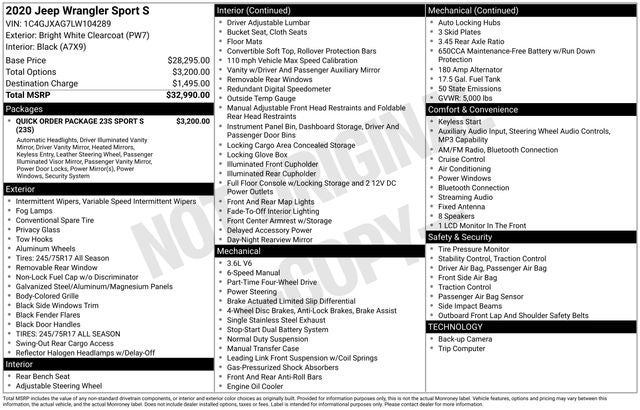 2020 Jeep Wrangler Sport S Bright White Clearcoat Clean Carfax, Back Up Camera, Push Button Start, Hands Free Calling, 4 Wheel Drive, Manual Transmission, Local Trade-in, Passed Rigorous Safety Inspection Performed by Certified Technician, Free Lifetime Car Washes, Free State Inspections, Wrangler Sport S, 2D Sport Utility, 3.6L V6 24V VVT, 6-Speed Manual, 4WD, Bright White Clearcoat, Black Cloth, Air Conditioning, Automatic Headlamps, Deep Tint Sunscreen Windows, Front 1-Touch Down Power Windows, Leather Wrapped Steering Wheel, Power Heated Mirrors, Quick Order Package 23S Sport S, R1234YF A/C Refrigerant, Remote Keyless Entry, Security Alarm, Speed Sensitive Power Locks, Sun Visors w/Illuminated Vanity Mirrors, Wheels: 17 x 7.5 Tech Silver Aluminum. Priced below KBB Fair Purchase Price!