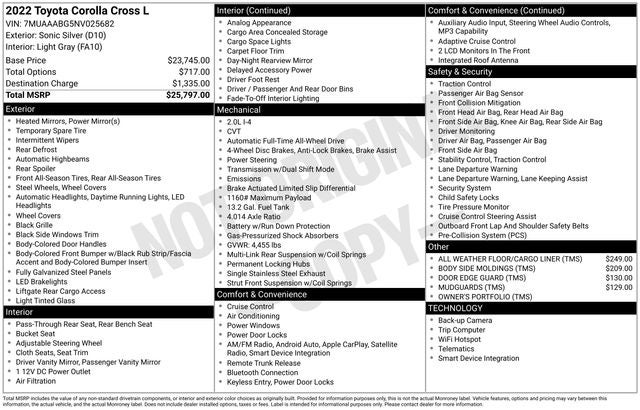 2022 Toyota Corolla Cross L Sonic Silver CarFax One Owner, Back Up Camera, Hands Free Calling, All Wheel Drive, Passed Rigorous Safety Inspection Performed by Certified Technician, Free Lifetime Car Washes, Free State Inspections, Corolla Cross L, 4D Sport Utility, 2.0L I4 PDI DOHC 16V LEV3-SULEV30 169hp, CVT, AWD, Sonic Silver, Light Gray w/Fabric Seat Trim. 29/32 City/Highway MPG