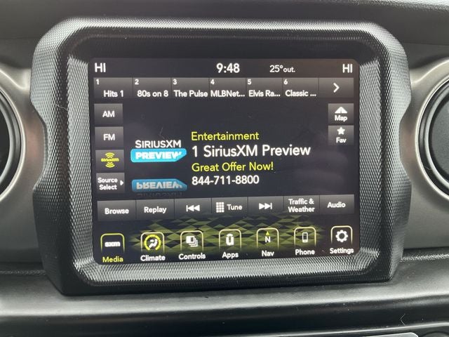 This 2023 Jeep Gladiator Willys in Sarge Green Clearcoat is nicely equipped with the following features 8.4 Radio & Premium Audio Group (1-Year SiriusXM Guardian Trial, 115V Auxiliary Power Outlet, 220 Amp Alternator, 400W Inverter, 4G LTE Wi-Fi Hot Spot, 5-Year SiriusXM Traffic Service, 5-Year SiriusXM Travel Link Service, 8.4 Touchscreen Display, Air Conditioning w/Auto Temperature Control, Alpine Premium Audio System, Apple CarPlay, Auto-Dimming Rear-View Mirror, Console Bin Task Light, Emergency/Assistance Call, Google Android Auto, GPS Antenna Input, GPS Navigation, HD Radio, Integrated Center Stack Radio, Integrated Voice Command w/Bluetooth®, Media Hub w/2 Charge Only USBs, Off-Road Info Pages, Radio: Uconnect 4C Nav w/8.4 Display, SiriusXM Radio Service, SiriusXM Satellite Radio, SiriusXM Traffic Plus, SiriusXM Travel Link, and USB Host Flip), Convenience Group (Daytime Running Lamp System and Universal Garage Door Opener), Quick Order Package 24W Willys (4-Wheel Drive Decal, 97 MPH Vehicle Max Speed Calibration, Anti-Spin Differential Rear Axle, Automatic Headlamps, Black Grille, Body Color Fender Flares (2-Piece), Deep Tint Sunscreen Windows, Front 1-Touch Down Power Windows, Front Heavy Duty Red Accent Shock Absorbers, Mold In Color Bumper w/Gloss Black, MOPAR All-Weather Slush Mats, Power Heated Mirrors, Power Tailgate Lock, Premium Wrapped Steering Wheel, Protection Sill Rails, Rear Heavy Duty Red Accent Shock Absorbers, Remote Keyless Entry, Security Alarm, Speed Sensitive Power Locks, Sun Visors w/Illuminated Vanity Mirrors, Wheels: 17 x 7.5 Black Aluminum, Willys, and Willys Hood Decal), Technology Group (Cluster 7.0 TFT Color Display and For More Info, Call 800-643-2112), Trailer Tow Package (240 Amp Alternator, Class IV Receiver Hitch, Heavy-Duty Engine Cooling, and Trailer Hitch Zoom), 3.73 Rear Axle Ratio, 4-Wheel Disc Brakes, 8 Speakers, ABS brakes, Air Conditioning, AM/FM radio, Apple CarPlay/Android Auto, Black 3-Piece Hard Top, Brake assist, Cloth Low-Back Bucket Seats, Compass, Delay-off headlights, Driver door bin, Driver vanity mirror, Dual front impact airbags, Dual front side impact airbags, Electronic Stability Control, Emergency communication system, Front anti-roll bar, Front Bucket Seats, Front Center Armrest w/Storage, Front Door Locks 2-Door Passive Entry (DISC), Front fog lights, Front reading lights, Integrated roll-over protection, Low tire pressure warning, Normal Duty Suspension, Occupant sensing airbag, Outside temperature display, ParkView Rear Back-Up Camera, Passenger door bin, Passenger vanity mirror, Power steering, Radio data system, Radio: Uconnect 4 w/7 Display, Rear anti-roll bar, Rear reading lights, Speed control, Split folding rear seat, Steering wheel mounted audio controls, Tachometer, Telescoping steering wheel, Tilt steering wheel, Traction control, Trip computer, Variably intermittent wipers, and Wheels: 17 x 7.5 Black Steel Styled.