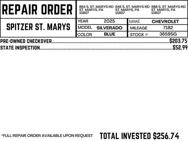 *Traded In On A New 2026 Chevrolet Silverado 2500 ZR2. Has Been Waiting For The New ZR2 In A Tan Color To Come In.* Trail Boss Package, Z71 Off-Road Package, Convenience Package, 5th Wheel Package, Snow Plow Prep / Camper Package, Safety Package, Heat Package, Remote Start Package, Chevtec Spray-On Bed Liner, EZ Lift Tailgate, All Weather Liners, Universal Home Remote, Air Conditioning, Auto-Dim Rearview Mirror, Keyless Entry, Parking Sensors, Backup Camera, Heated Steering Wheel, Heated Power Mirrors, Power Locks, Power Windows, Cruise Control, Dual Climate Control, Tilt And Telescopic Steering Wheel, Bluetooth®, Sirius XM, OnStar, MP3, 6.6L V8, Lakeshore Blue Metallic, Black Cloth.